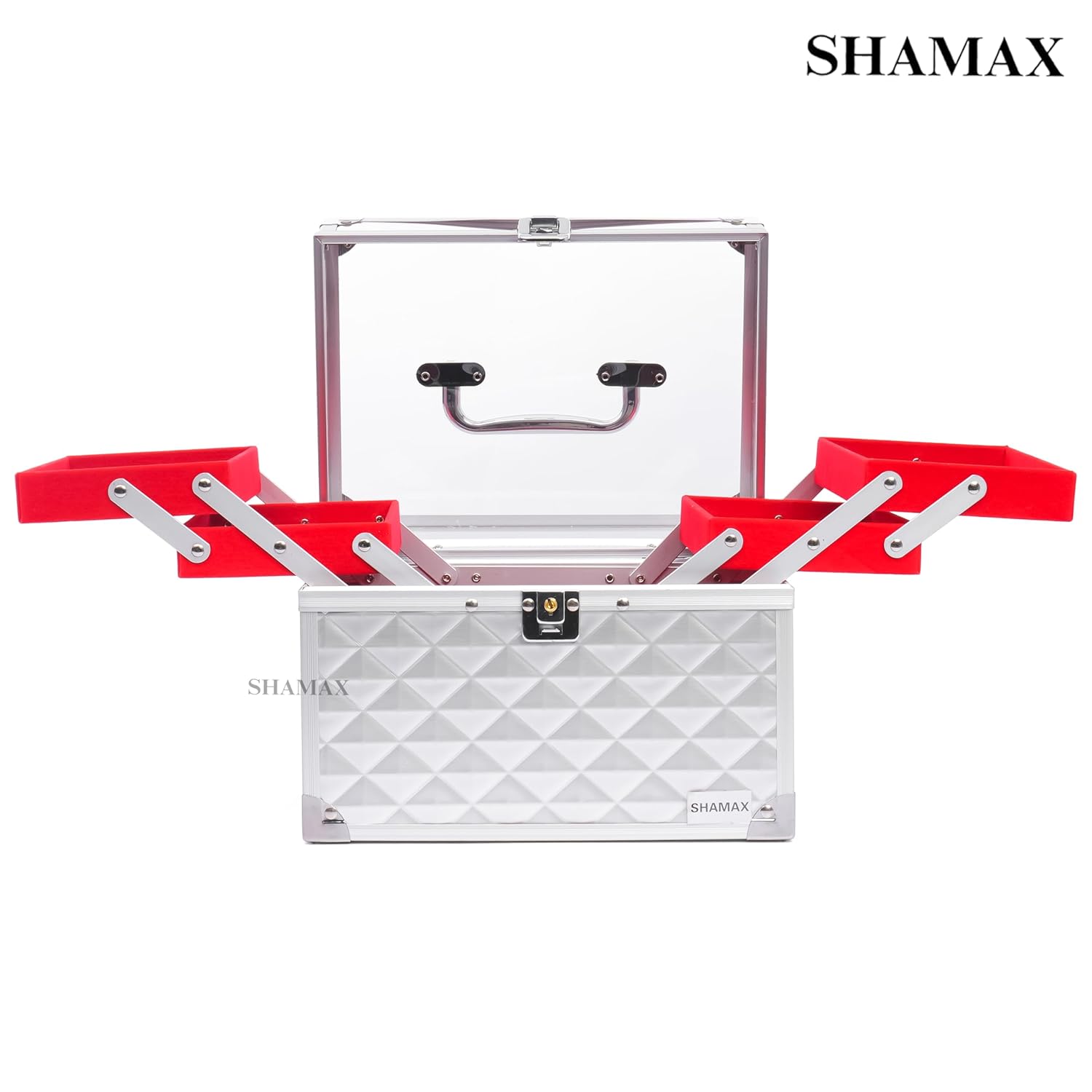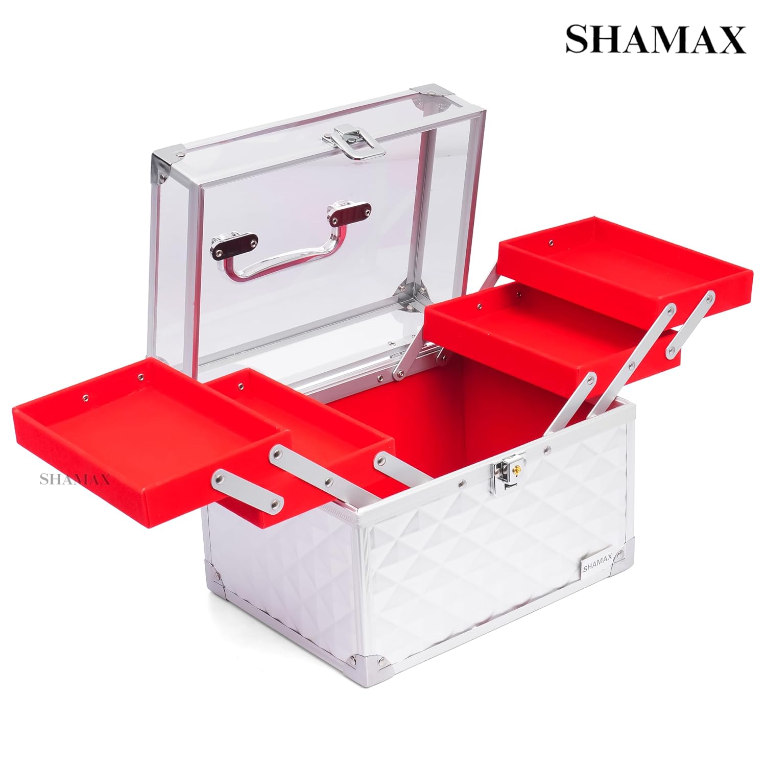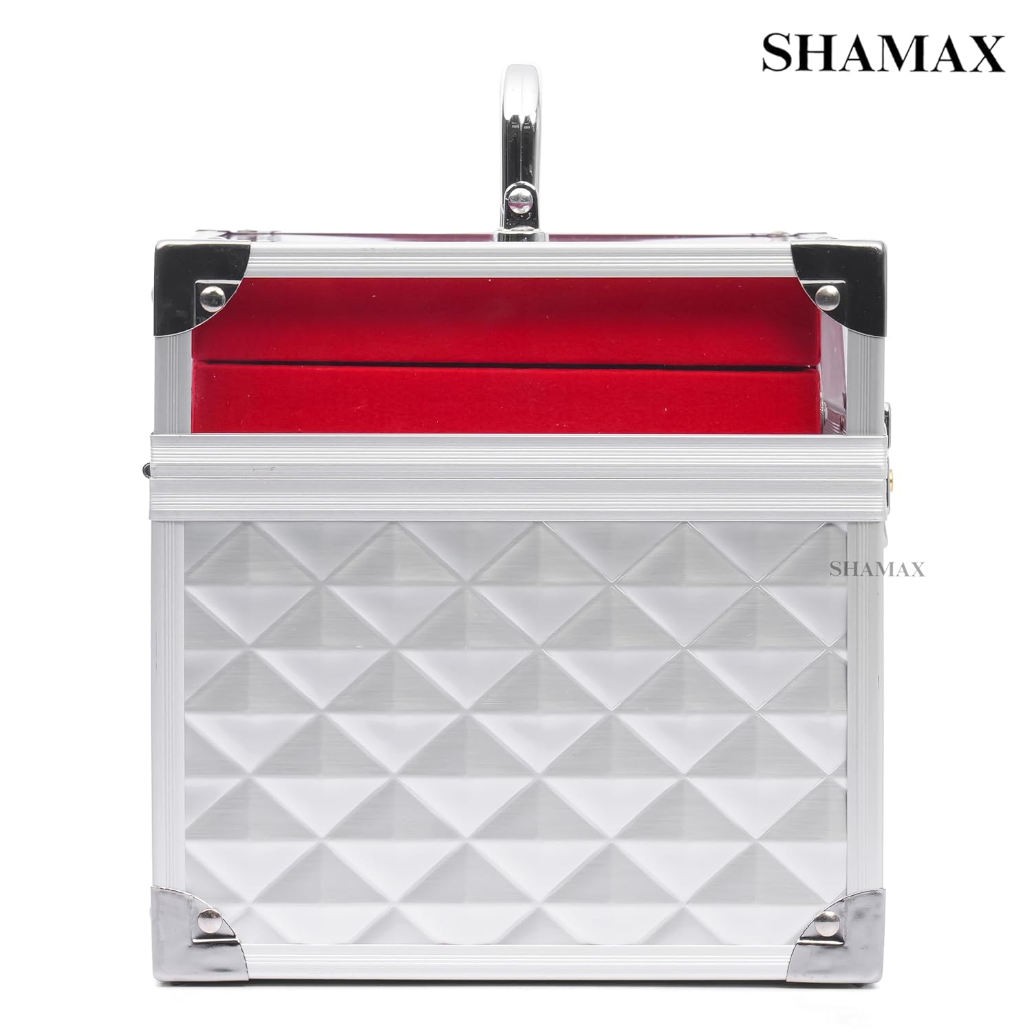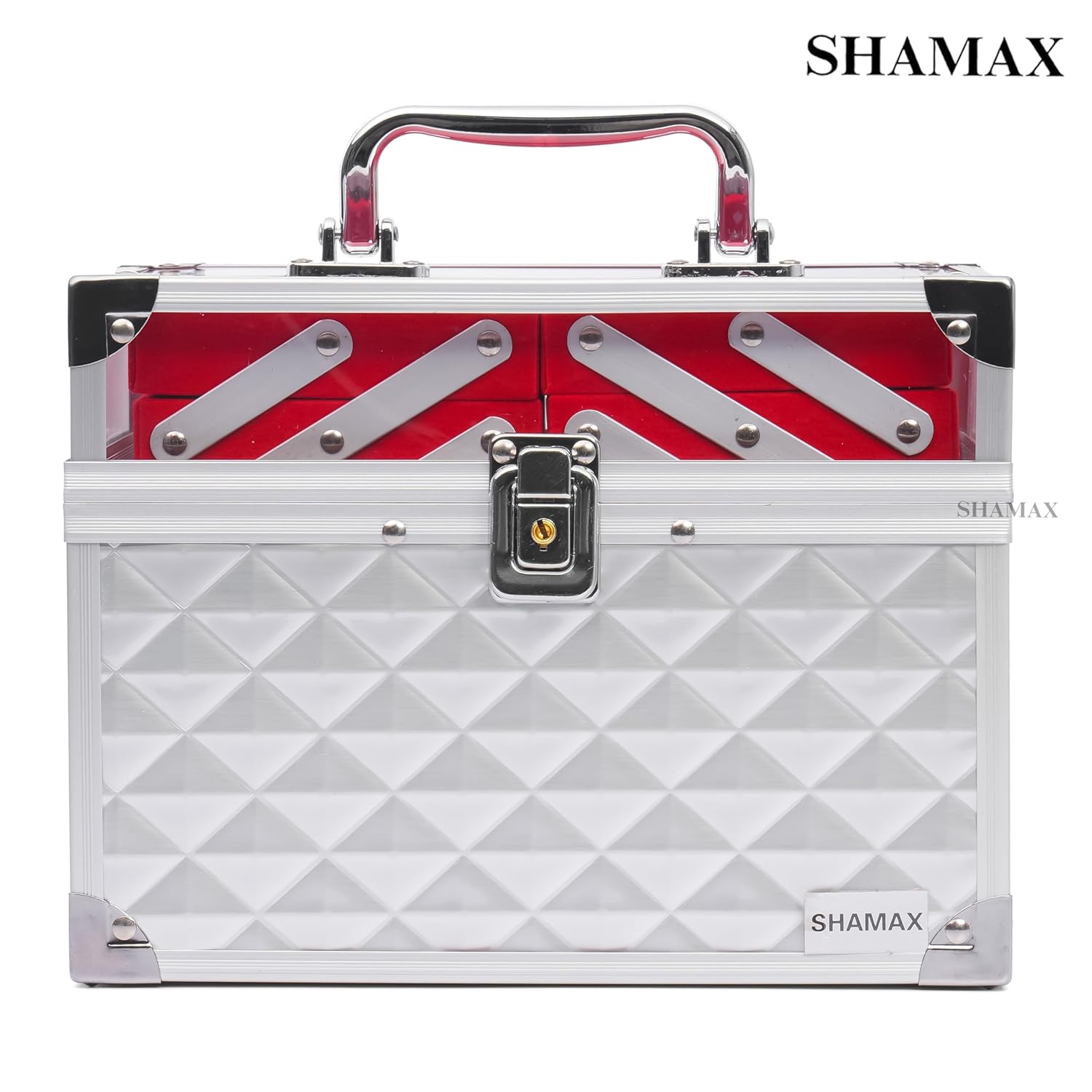 Brand: SHAMAX Product Type: Makeup Organizer / Shringar Dani Box Material: Premium hard body with metal frame & fittings Color: Rose Gold outer body with Red inner trays Finish: Glossy textured exterior Tray System: Multi-layer expandable trays Mirror: Built-in top mirror Lock Type: Secure metal combination lock Handle: Strong metal carry handle Closure Type: Lockable lid Dimensions: 26 × 17 × 20 cm (L × W × H) Usage: Makeup, cosmetics, jewellery, skincare & beauty accessories storage Suitable For: Women & girls Occasion: Daily use, bridal use, gifting